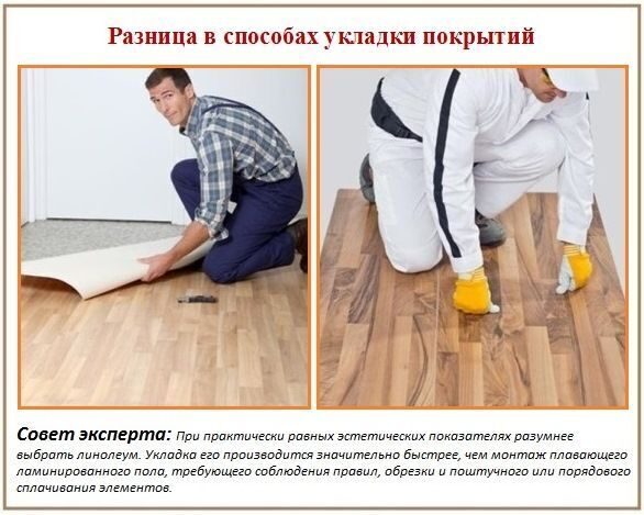 ΠΡΠΈ ΠΏΡΠΎΠ²Π΅Π΄Π΅Π½ΠΈΠΈ ΡΠ΅ΠΌΠΎΠ½ΡΠ° ΡΠ°ΡΡΠΎ Π²ΠΎΠ·Π½ΠΈΠΊΠ°Π΅Ρ Π²ΠΎΠΏΡΠΎΡ, ΡΡΠΎ Π»ΡΡΡΠ΅ β Π»Π°ΠΌΠΈΠ½Π°Ρ ΠΈΠ»ΠΈ Π»ΠΈΠ½ΠΎΠ»Π΅ΡΠΌ Π² ΠΊΠ²Π°ΡΡΠΈΡΠ΅? ΠΠ΄Π½ΠΎΠ·Π½Π°ΡΠ½ΠΎΠ³ΠΎ ΠΎΡΠ²Π΅ΡΠ° Π½Π΅ ΡΡΡΠ΅ΡΡΠ²ΡΠ΅Ρ, ΠΏΠΎΡΠΊΠΎΠ»ΡΠΊΡ ΠΊΠ°ΠΆΠ΄ΡΠΉ ΠΈΠ· ΠΌΠ°ΡΠ΅ΡΠΈΠ°Π»ΠΎΠ² ΠΈΠΌΠ΅Π΅Ρ Π½Π΅ΡΠΊΠΎΠ»ΡΠΊΠΎ ΠΊΠ°ΡΠ΅Π³ΠΎΡΠΈΠΉ, ΡΡΡΠ΅ΡΡΠ²Π΅Π½Π½ΠΎ ΠΎΡΠ»ΠΈΡΠ°ΡΡΠΈΡ ΡΡ ΠΏΠΎ ΠΎΡΠ½ΠΎΠ²Π½ΡΠΌ ΡΠΊΡΠΏΠ»ΡΠ°ΡΠ°ΡΠΈΠΎΠ½Π½ΡΠΌ Ρ Π°ΡΠ°ΠΊΡΠ΅ΡΠΈΡΡΠΈΠΊΠ°ΠΌ. ΠΡΠΎΠΌΠ΅ ΡΠΎΠ³ΠΎ, Π²ΡΠ±ΠΎΡ Π²ΠΎ ΠΌΠ½ΠΎΠ³ΠΎΠΌ ΠΎΠΏΡΠ΅Π΄Π΅Π»ΡΠ΅ΡΡΡ ΠΎΡΠΎΠ±Π΅Π½Π½ΠΎΡΡΡΠΌΠΈ ΠΏΠΎΠΌΠ΅ΡΠ΅Π½ΠΈΡ β ΠΏΠΎΡΠ΅ΡΠ°Π΅ΠΌΠΎΡΡΡΡ, Π²Π»Π°ΠΆΠ½ΠΎΡΡΡΡ, ΠΏΠΎΡΡΠ΅Π±Π½ΠΎΡΡΡΡ Π² ΡΠ°Π½ΠΎΠ±ΡΠ°Π±ΠΎΡΠΊΠ΅, Π²Π΅ΡΠΎΡΡΠ½ΠΎΡΡΡΡ ΠΌΠ΅Ρ Π°Π½ΠΈΡΠ΅ΡΠΊΠΈΡ ΠΏΠΎΠ²ΡΠ΅ΠΆΠ΄Π΅Π½ΠΈΠΉ ΠΈ Ρ.ΠΏ. Π‘ΡΡΠ΅ΡΡΠ²ΡΠ΅Ρ ΠΈ Π΅ΡΠ΅ ΠΎΠ΄ΠΈΠ½ Π½ΡΠ°Π½Ρ β Π½Π΅ΠΊΠΎΡΠΎΡΡΠ΅ ΡΠ²ΠΎΠΉΡΡΠ²Π° Π½Π°ΠΏΠΎΠ»ΡΠ½ΡΡ ΠΏΠΎΠΊΡΡΡΠΈΠΉ Π·Π°Π²ΠΈΡΡΡ ΠΎΡ ΡΠΊΠ»Π°Π΄ΠΊΠΈ β ΠΊΠ°ΡΠ΅ΡΡΠ²Π° Π΅Π΅ ΠΈΡΠΏΠΎΠ»Π½Π΅Π½ΠΈΡ, ΠΈΡΠΏΠΎΠ»ΡΠ·ΠΎΠ²Π°Π½ΠΈΡ ΠΏΠΎΠ΄Π»ΠΎΠΆΠΊΠΈ ΠΈ Π΄Ρ.