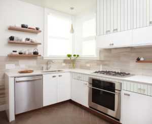 Благодаря тому, что такое покрытие легко очищается от загрязнений и небольших капель воды (постоянное воздействие влаги может быть губительным для материала), вы можете закрепить ламинат на стену кухни. При наличии свободной стены он станет отличным вариантом для декорирования поверхности, а если таких стен нет, вы можете украсить с помощью панелей фартук в рабочей зоне кухни.