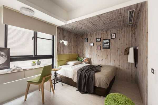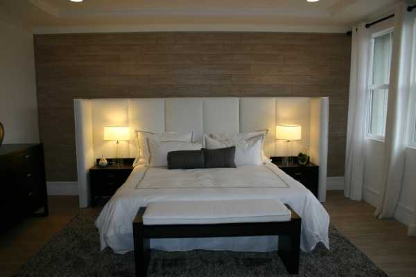 Теперь взгляните на фото ламината на стене в интерьере спальни. Несмотря на то, что такой материал нехарактерен для отделки стен, он может смотреться вполне уместно в уютном, расслабляющем дизайне комнаты. Выбор места для этой облицовки аналогичен гостиной: вы можете выделить отдельную зону (например, гардеробную), создать акценты над изголовьем кровати или в нишах.
