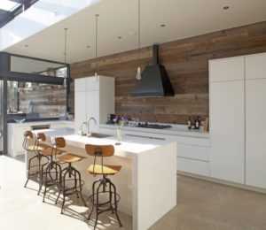 Также вы можете украсить остров или барную стойку: выполните их облицовку с помощью аналогичных материалов – это еще одни модный тренд.