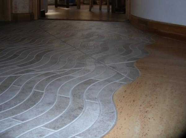 Добиваясь оригинального дизайна полов в помещении можно выровнять основание под укладку так, как угодно владельцу. В таком случае комната легко делится не просто на две части, а из двух видов покрытия создается оригинальный рисунок.
