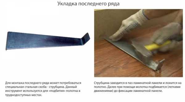 - Укладка последнего ряда. Для монтажа крайнего ряда потребуется металлическая струбцина. Ламинатная ламель заводится в “паз” уложенного ряда и ложится на пол. Далее берется струбцина и изогнутым концом устанавливается в “паз” только что уложенной панели. После ударами киянки по струбцине полотно фиксируется до нужного положения.