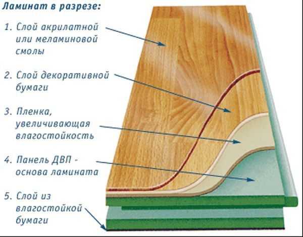 Ламинат – продукт синтетический. В его структуре есть слои, состоящие из крафт-бумаги, ДВП, пластика. Плюс – защитное покрытие (как правило, на основе меламиновой смолы), повышающее прочность образцов. Торцы панелей обрабатываются составами на основе воска, что позволяет избежать впитывания жидкостей.
