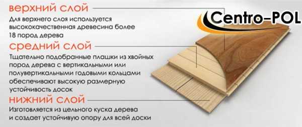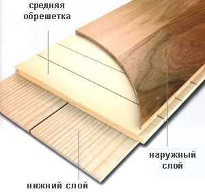 Структура паркетной доски строится также из нескольких слоев, расположенных друг к другу перпендикулярно и скрепленных между собою клеевым составом. Что обеспечивает прочность, геометрическую стабильность формы в условиях различной влажности и нестабильной температуры, а также эксплуатационную долговечность покрытия. Традиционная трехслойная паркетная доска состоит из: