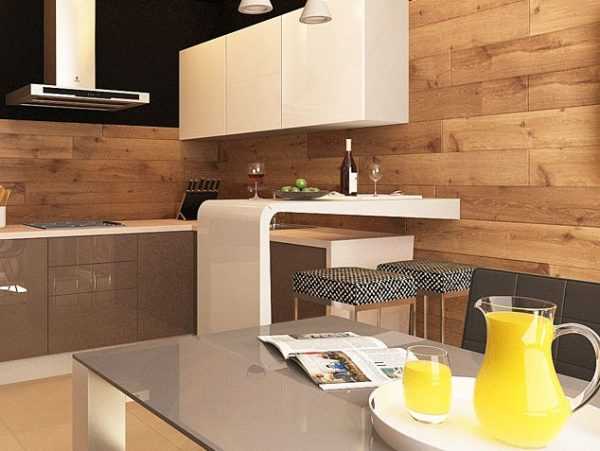 В кухне ламинат чаще применяется в виде фартука над рабочей поверхностью. Его цвет подбирают под фасады кухонного гарнитура. По своим свойствам такое покрытие не будет уступать керамической плитке, тем более что можно подобрать панели, имитирующие керамику, мрамор, гранит. Но оно проще в установке и дешевле по стоимости. Уход за таким кухонным фартуком несложен. Эффектно смотрится стена с такими панелями в обеденной зоне. Ламинат, имитирующий дерево, органично вписывается в кухни стиля кантри.