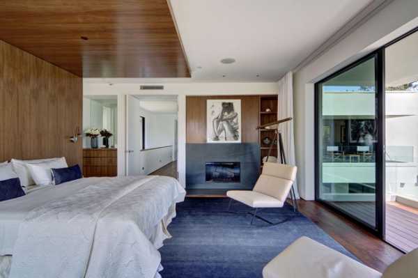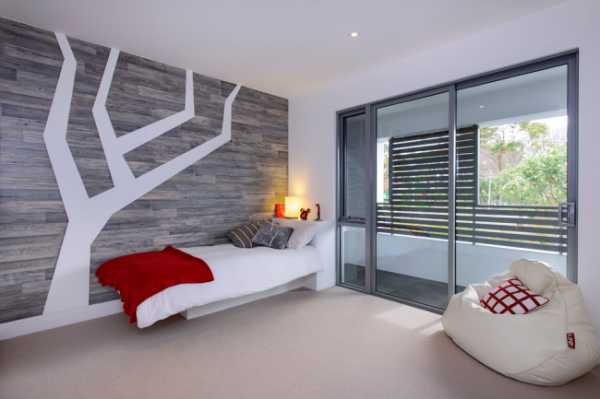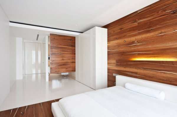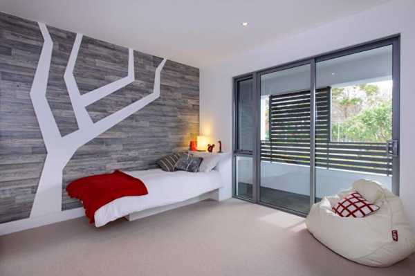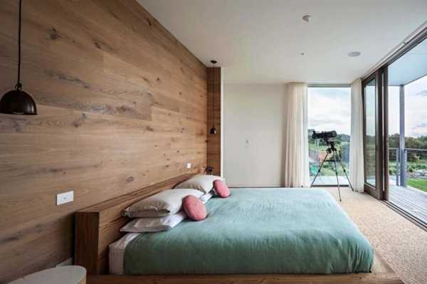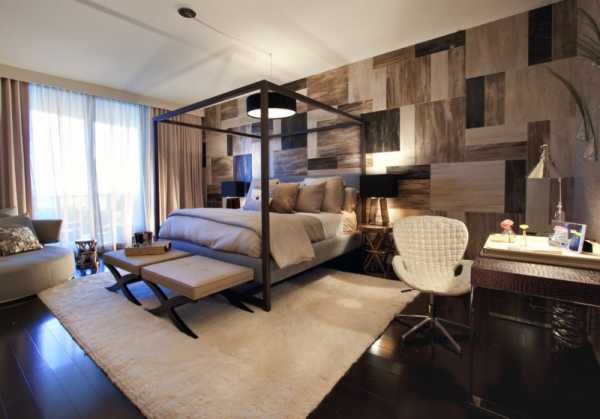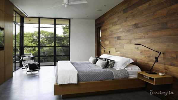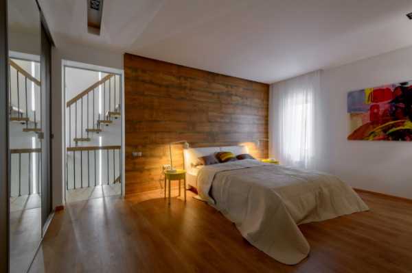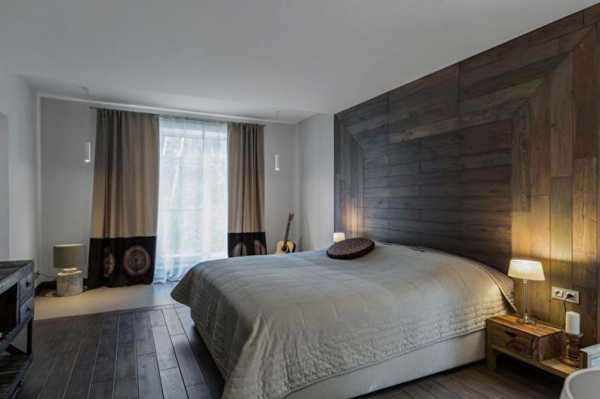 Стильная современная спальня с ламинатом на стене и на полу