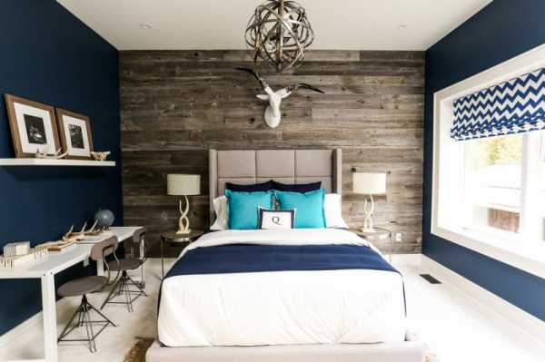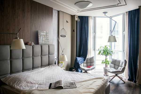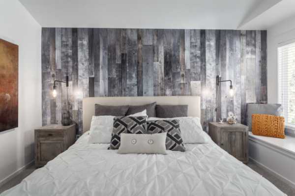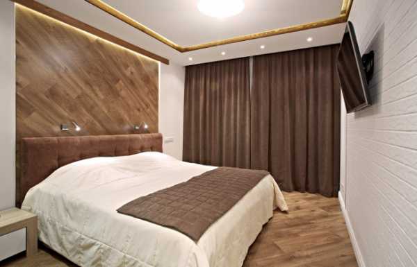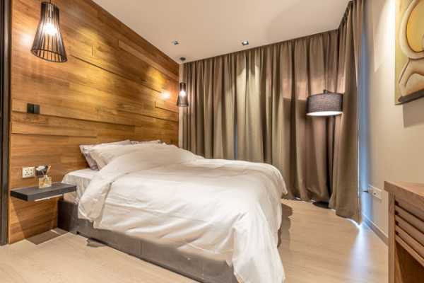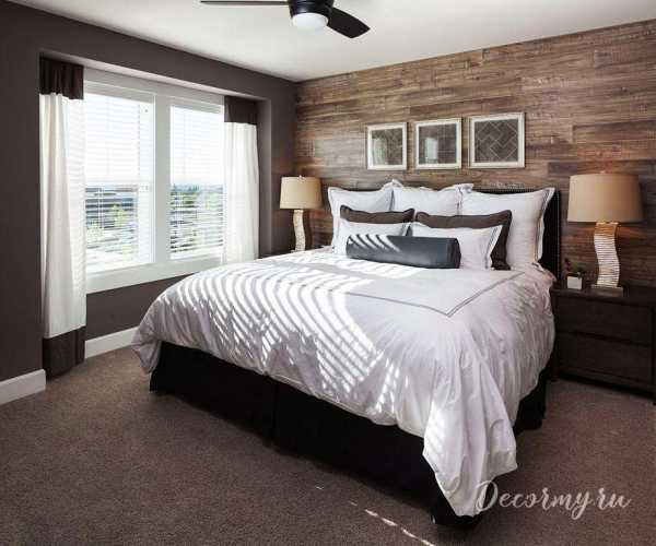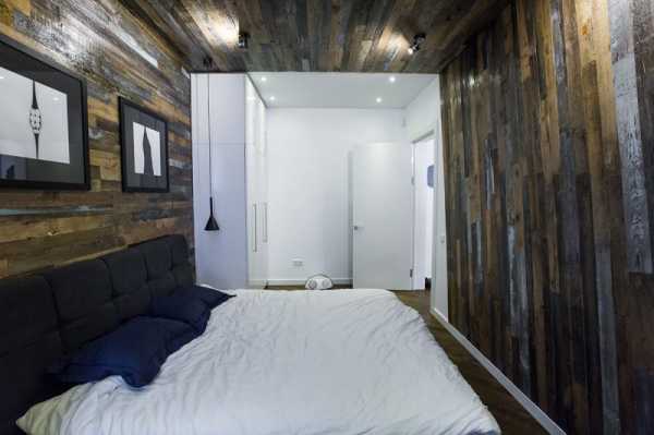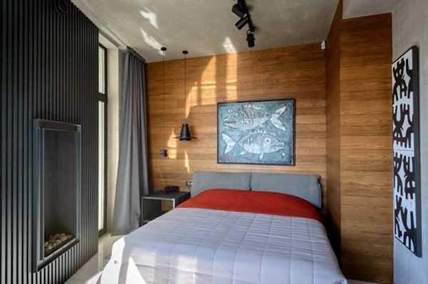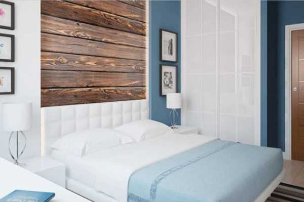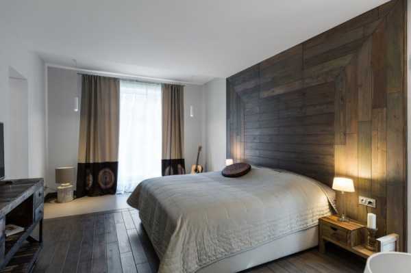 Довольно непривычным дизайном интерьера стало создание ламинатной стены вместо изголовья.