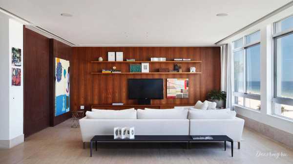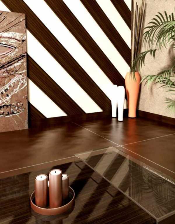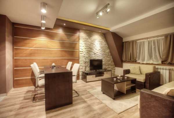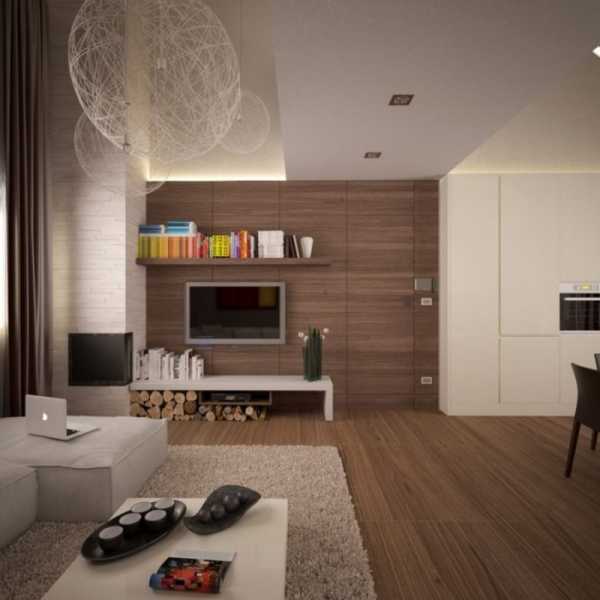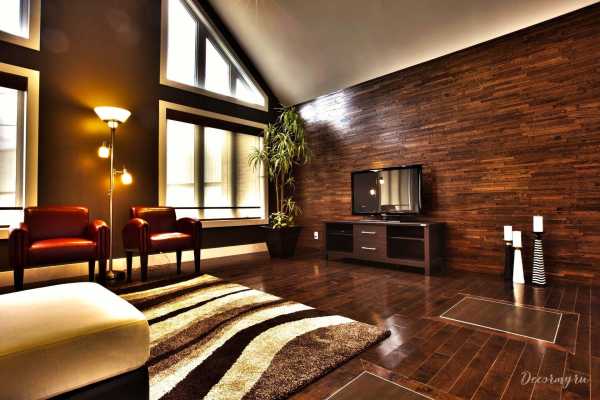 В последнее время дизайнеры отмечают возросшее количество отделки центральной стены зала ламинатом темно-коричневого или просто коричневого цвета, аккурат в качестве фона для подвешенного телевизора.