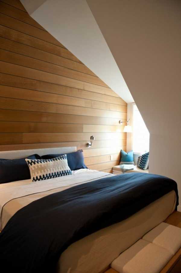 Маленькую мансардную спальню украшает ламинат, которым отделана одна из стен