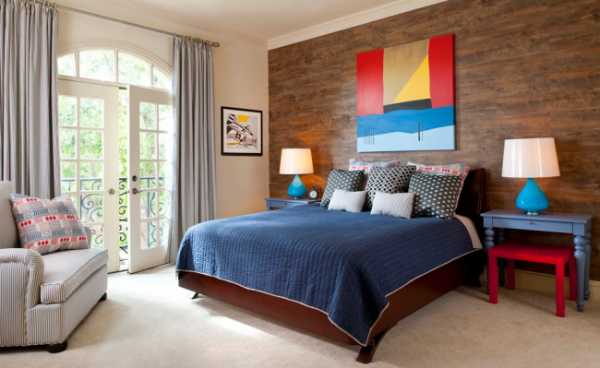 Классическая спальня с ламинатом на стене и яркими аксессуарами