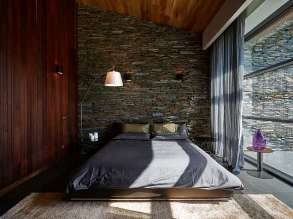Спальня в стиле лофт с темно-коричневым ламинатом на одной стене и декоративным камнем на другой