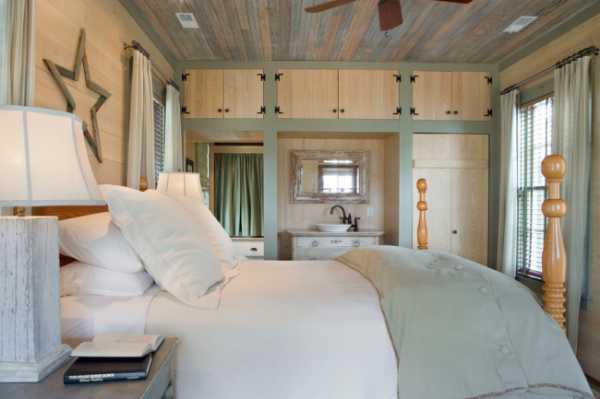 Спальня в стиле кантри со светло-бежевым ламинатом на стенах