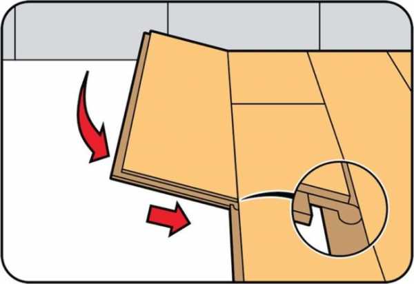 Первый ряд нужно укладывать внутренней частью замка к стене. Фиксируется замок из приподнятого положения доски ламината и медленного её опускания.