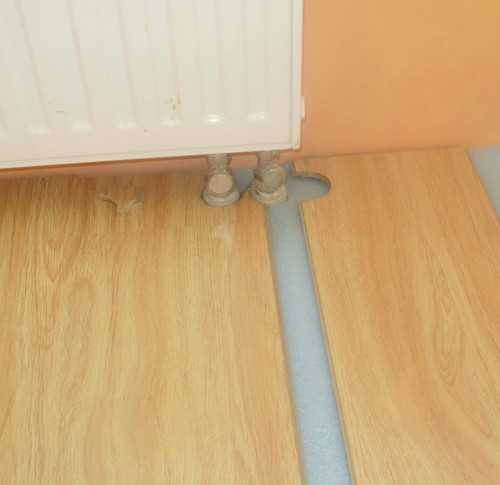 Выступающие из пола трубы отопления или декоративные углы интерьера необходимо правильно обходить чтобы не испортить внешний вид напольного покрытия. Обходить трубы можно с помощью специального приёма подрезки.