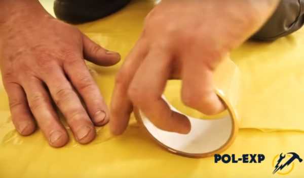 На самой пленке не должно быть повреждений и разрывов, она должна быть идеально целой. Так что бракованный материал тут не может быть использован. Сама пленка должна настилаться с нахлестом на стены, а отдельные ее полосы – укладываться с нахлестом друг на друга в 20 см. Зафиксировать отдельные полосы материала и соединить их между собой можно при помощи строительного скотча. На худой конец сойдет и обычный, но это – не лучший вариант.