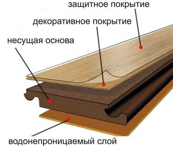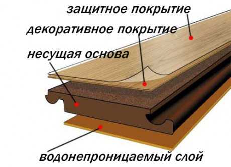 - основного, который изготавливается из ДВП или ДСП и является несущим. Именно этот слой обеспечивает прочность покрытия, но при этом боится воздействия влаги;