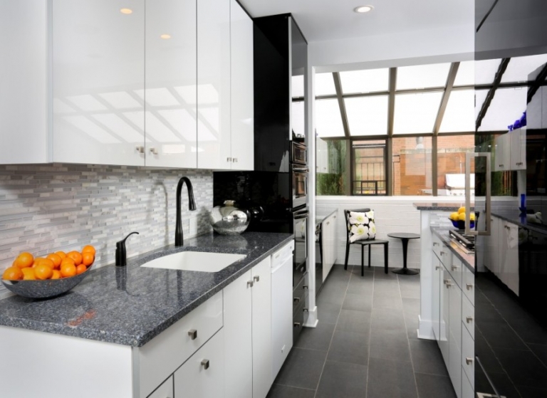 Белая плитка на кухне: черно-белая и бежевая глянцевая прямоугольная плитка