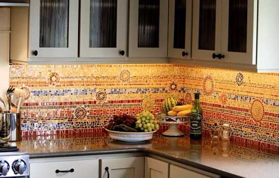 - Для оформления фартука отлично подойдет мозаика. Облицовка осуществляется путем укладки маленьких разноцветных или разнотонных элементов.