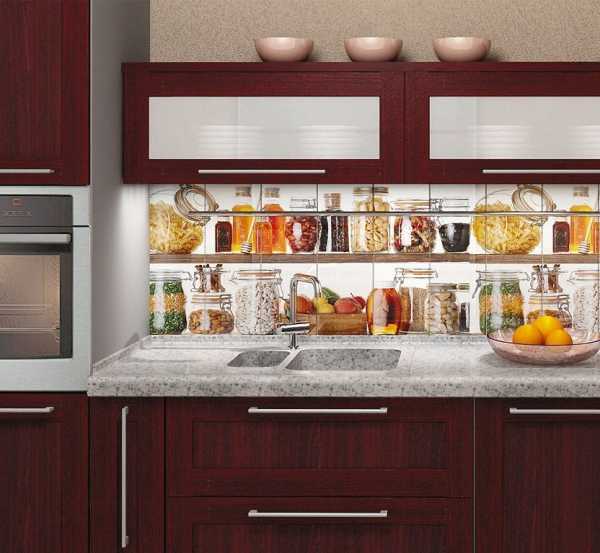- Изображения – плитка может выступать элементом «картины» или представлять собой отдельное изображение. В последнем случае кафель имеет довольно большие размеры. Идея изобразить на фартуке плоды, овощи или даже готовые блюда никогда не устаревает.