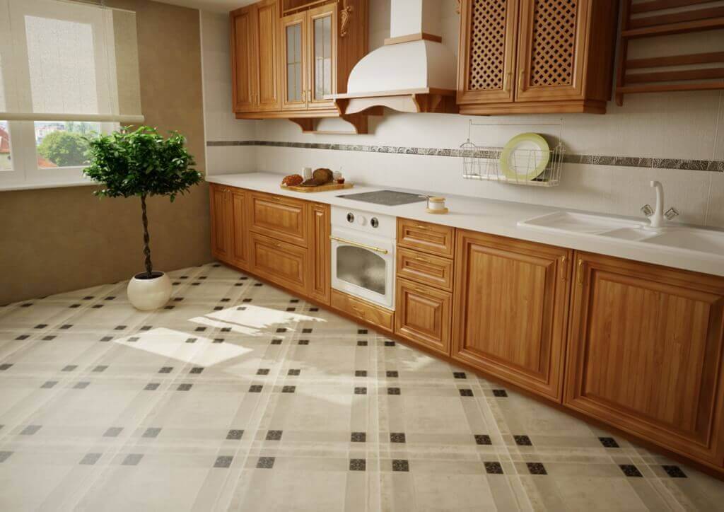 Многие домовладельцы предпочитают не останавливаться на использовании керамики для облицовки кухонного фартука и применяют плитку для отделки полов.
