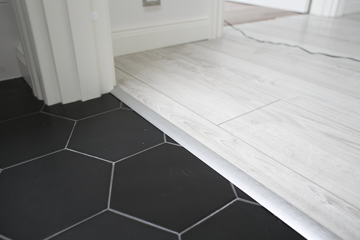 Металлические переходные планки — это тонкие, незаметные способы перехода от кафельного пола к другому материалу, например ламинату.