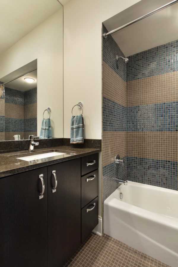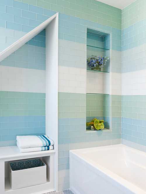 Π Π°Π·ΡΠ°Π±Π°ΡΡΠ²Π°Ρ Π΄ΠΈΠ·Π°ΠΉΠ½ Π½Π΅ ΡΡΠΎΠΈΡ Π·Π°Π±ΡΠ²Π°ΡΡ, ΡΡΠΎ, ΠΏΡΠ°Π²ΠΈΠ»ΡΠ½ΠΎ ΡΠ°ΡΠΏΠΎΠ»ΠΎΠΆΠΈΠ² Π°ΠΊΡΠ΅Π½ΡΡ Π²Ρ ΡΠΌΠΎΠΆΠ΅ΡΠ΅ Π²ΠΈΠ·ΡΠ°Π»ΡΠ½ΠΎ ΡΠΊΠΎΡΡΠ΅ΠΊΡΠΈΡΠΎΠ²Π°ΡΡ Π³Π΅ΠΎΠΌΠ΅ΡΡΠΈΡ ΠΏΠΎΠΌΠ΅ΡΠ΅Π½ΠΈΡ. Π’Π°ΠΊ, Π΄Π»Ρ Π·ΡΠΈΡΠ΅Π»ΡΠ½ΠΎΠ³ΠΎ ΡΠ²Π΅Π»ΠΈΡΠ΅Π½ΠΈΡ ΡΠ°Π½ΡΠ·Π»Π° Π»ΡΡΡΠ΅ ΠΈΡΠΏΠΎΠ»ΡΠ·ΠΎΠ²Π°ΡΡ Π½Π΅Π±ΠΎΠ»ΡΡΠΎΠΉ ΠΊΠ°ΡΠ΅Π»Ρ Ρ ΠΎΠ»ΠΎΠ΄Π½ΠΎ Π³ΠΎΠ»ΡΠ±ΡΡ , ΡΠ΅ΡΠΎ-Π±ΠΈΡΡΠ·ΠΎΠ²ΡΡ ΠΈ ΡΠ΅ΡΠ΅Π±ΡΠΈΡΡΡΡ ΡΠΎΠ½ΠΎΠ². ΠΡΠΈ ΡΡΠΎΠΌ ΠΏΠ»ΠΈΡΠΊΡ Π»ΡΡΡΠ΅ ΡΠΊΠ»Π°Π΄ΡΠ²Π°ΡΡ Π³ΠΎΡΠΈΠ·ΠΎΠ½ΡΠ°Π»ΡΠ½ΠΎ, Π° Π½Π° ΠΏΠΎΠ²Π΅ΡΡ Π½ΠΎΡΡΠΈ ΠΏΠΎΠ»Π° ΡΡΠ΄Ρ Π΄ΠΎΠ»ΠΆΠ½Ρ ΡΠ°ΡΠΏΠΎΠ»Π°Π³Π°ΡΡΡΡ Π΄ΠΈΠ°Π³ΠΎΠ½Π°Π»ΡΠ½ΠΎ. ΠΡΡΡΠ΅ ΠΎΡΡΠ°Π½ΠΎΠ²ΠΈΡΡΡΡ Π½Π° Π²ΡΠ²Π΅ΡΠ΅Π½Π½ΠΎΠΌ ΠΏΠΎΠΏΠ΅ΡΠ΅ΡΠ½ΠΎΠΌ ΠΎΡΠ½Π°ΠΌΠ΅Π½ΡΠ΅ ΠΈΠ»ΠΈ Π°Π±ΡΡΡΠ°ΠΊΡΠ½ΡΡ ΠΏΠΎΠ»ΠΎΡΠ°Ρ . Π’Π°ΠΊΠΆΠ΅ Π·ΡΠΈΡΠ΅Π»ΡΠ½ΠΎ ΡΠ΄Π΅Π»Π°ΡΡ Π²Π°Π½Π½ΡΡ ΠΊΠΎΠΌΠ½Π°ΡΡ Π±ΠΎΠ»ΡΡΠ΅ ΠΏΠΎΠΌΠΎΠ³ΡΡ ΡΡΠΈΠ·Ρ, ΠΊΠΎΡΠΎΡΡΠ΅ ΡΠ»Π΅Π΄ΡΠ΅Ρ ΡΠΊΠ»Π°Π΄ΡΠ²Π°ΡΡ Π² ΠΌΠ΅ΡΡΠ°Ρ ΡΠΎΡΡΡΠΊΠΎΠ²ΠΊΠΈ ΡΡΠ΅Π½Ρ Ρ Π²Π΅ΡΡ Π½ΠΈΠΌΠΈ ΠΈ Π½ΠΈΠΆΠ½ΠΈΠΌΠΈ ΠΏΠ΅ΡΠ΅ΠΊΡΡΡΠΈΡΠΌΠΈ ΠΈΠ»ΠΈ ΠΆΠ΅ ΡΠ΄Π΅Π»Π°ΡΡ Π±ΠΎΡΠ΄ΡΡΡ ΠΈΠ· ΠΏΠ»ΠΈΡΠΊΠΈ ΠΊΠΎΠ½ΡΡΠ°ΡΡΠ½ΠΎΠ³ΠΎ ΡΠ²Π΅ΡΠ°.