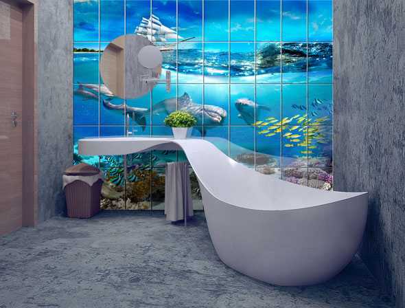 Интересно, как быстро новые технологии врываются в быт человека! Это касается и 3D технологий. Кафельная плитка в такой технике позволяет в обыкновенной ванной комнате создать необычный интерьер, поражая реальностью изображения. Так, можно, например, «установить» аквариум или создать водный мир, населенные яркими рыбками, под ногами. Выбор идей производителей не ограничен.