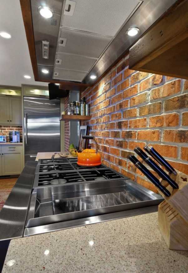 Это может быть стойка или зона расположения грубы в загородном доме. Если говорить о кухне, то можно оформить не только фартук, но любую стену целиком, ведь материал отлично переносит высокую температуру.