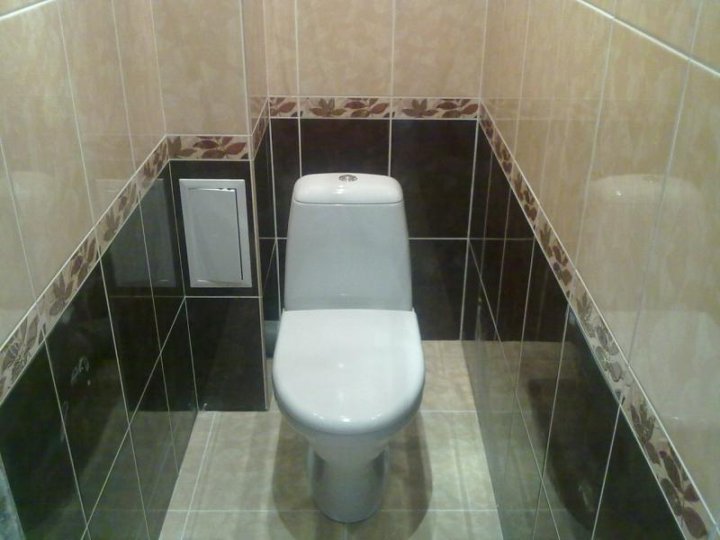 Для облицовки стен и потолка туалетной комнаты может использоваться плитка одного или нескольких размеров, одинаковая или разная по фактуре, однотонная или цветная и т.д.