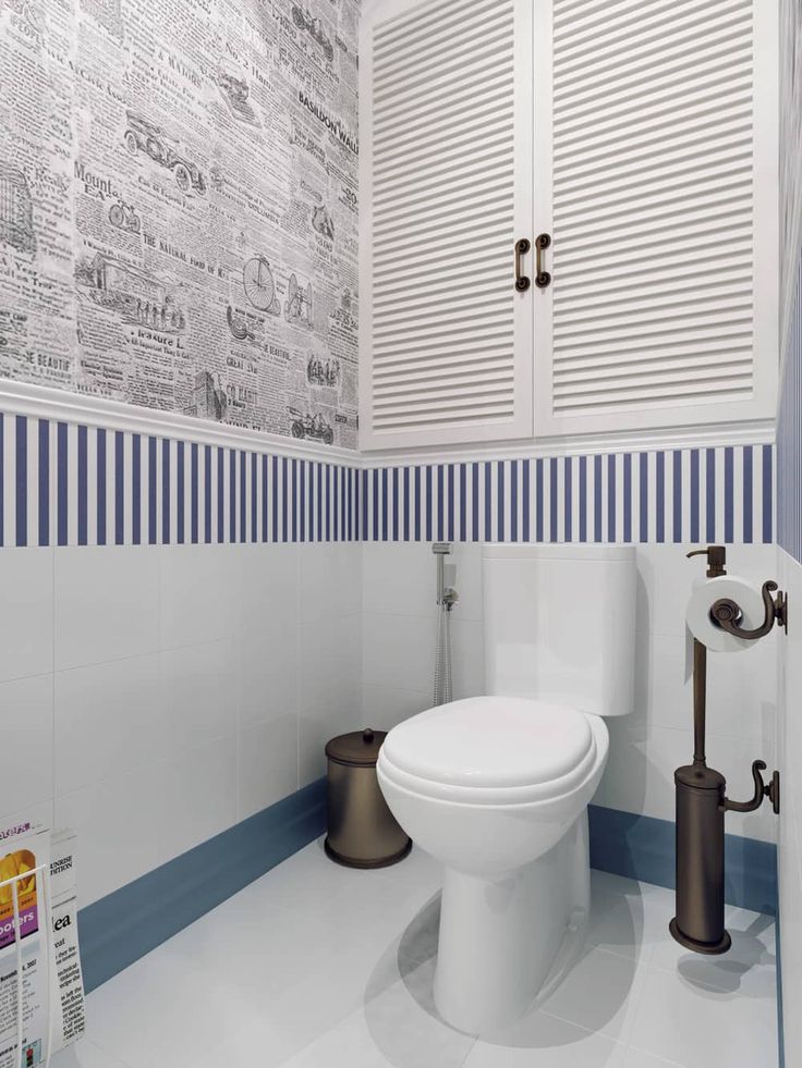 Один из самых распространенных вариантов оформления маленькой туалетной комнаты – разделение стен по горизонтали при помощи бордюра. Верхняя часть комнаты оформляется в светлых оттенках, нижняя – в более темных, но не чересчур мрачных. Хорошо смотрятся сочетания контрастных по цвету оттенков одного цвета, например, лимонный + желтый, голубой + синий, салатовый + зеленый и т.д.