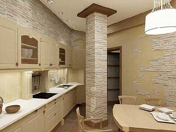 Красиво смотрится такая кладка на кухне, где по замыслу дизайнера нужно создать атмосферу старинного дома. Декоративный кирпич для внутренней отделки в сочетании с дубовыми балками под потолком и деревянным полом придадут помещению неповторимую деревенскую атмосферу.