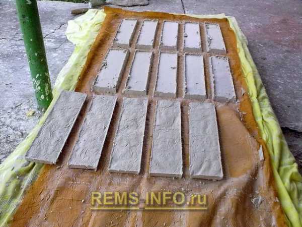 Под форму я подстелил материю, которая забирает влагу, так плитка быстрее сохнет и легко вынимается из формы. Узор материи будет на плитке. Особенности такой формы в том, что нужно через 2 минуты после заливки ножом пройтись по контуру каждой плитки, иначе она пристанет к дереву и никак ее не отскрести потом. Плитку складывать на ровную поверхность чтобы она не гнулась при высыхании.
