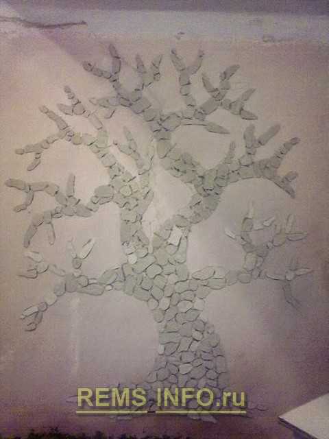 - вырезал маленькие «камушки» из плитки и наклеил на стену, так вышло дерево;