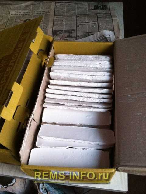 Для изготовления плитки использовал гипс и клей на гипсовой основе «Перфликс». Можно делать и только из гипса. Раствор в соотношении 0,9л. воды, 1,3 кг. гипса и 0,3 кг. клея. Порядок такой – в воду насыпаем сухие компоненты и размешиваем миксером на дрели (шуруповерте). Сначала воду потом гипс! Этого раствора мне хватало на 25 плиток. Размер готовой плитки 0,25х0,08х0,01. Гипс может быть любой марки, я использовал самый дешевый Г-5.