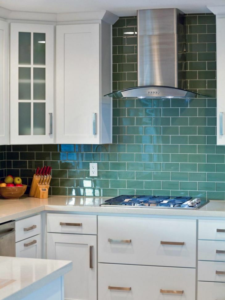 Цветовая вариация зелено-голубой глазури на этой шестиугольной плитке создает прохладную атмосферу. Оттеночный эффект сот прямо у себя дома на этой современной кухне.