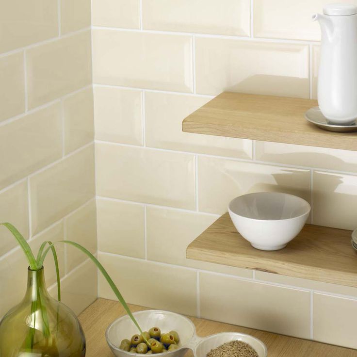 Винтажный стиль в интерьере кухни достигнут благодаря использованию плитки с глянцевой поверхностью расцветки «кофе с молоком». На ее фоне выразительно смотрится белая посуда, живые цветы и яркие декорации.