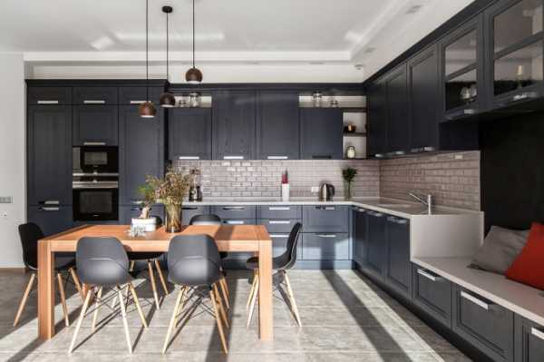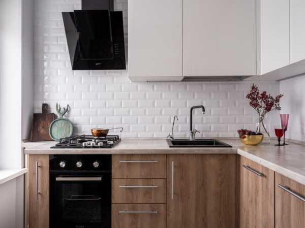 - Матовый или глянцевый черный кабанчик смотрится эффектно и в сочетании с черными/белыми гладкими фасадами гарнитура, и в комбинации с деревом теплых и холодных оттенков.