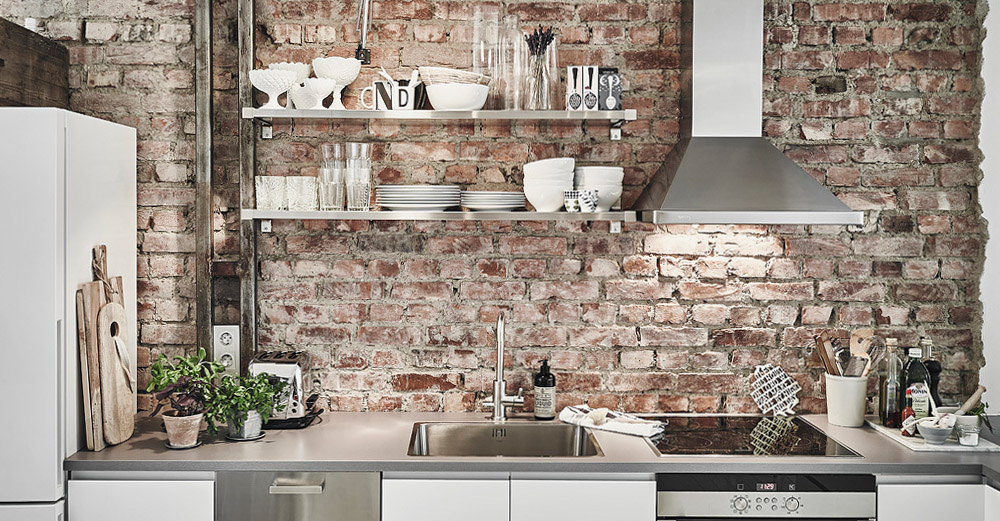 Фартук под кирпич прекрасно сочетается со всеми материалами отделки — от дерева и стекла до бронзовых декоров, нужно только грамотно расставить акценты, чтобы ваша кухня ожила.