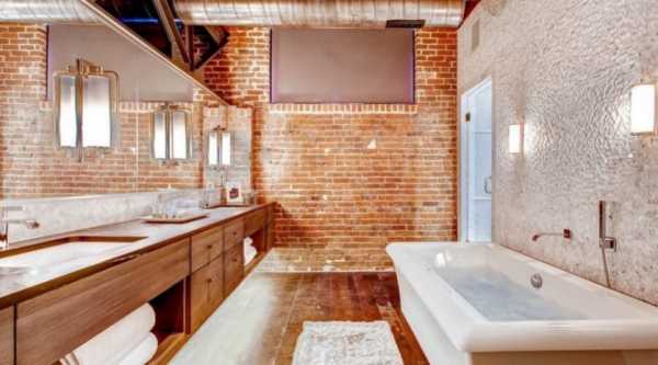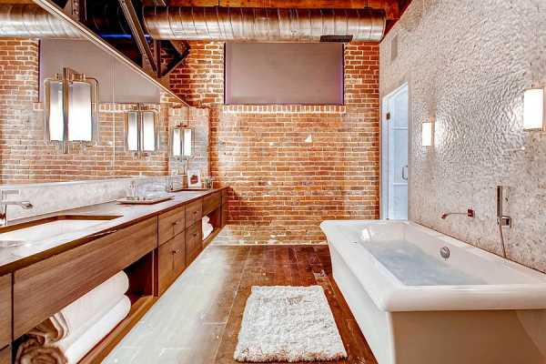 Кирпич и дерево создают элегантную индустриальную ванную комнату