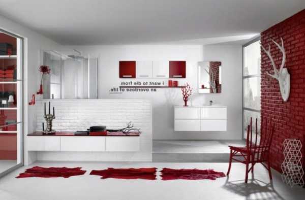 Снимаем шляпы перед дизайнером этой ванной! Выкрашенные в кроваво-красный цвет кирпичные стены, разбавлены этой же плиткой, но уже в белом цвете. Такой вариант цветового решения задает настроение, накаляет страсти. Поэтому-то придется не каждому по вкусу. Эксперименты с контрастом возможны только в большой ванной, где яркие детали будут достаточно удалены друг от друга, иначе цветовые пятна потеряют эффект.