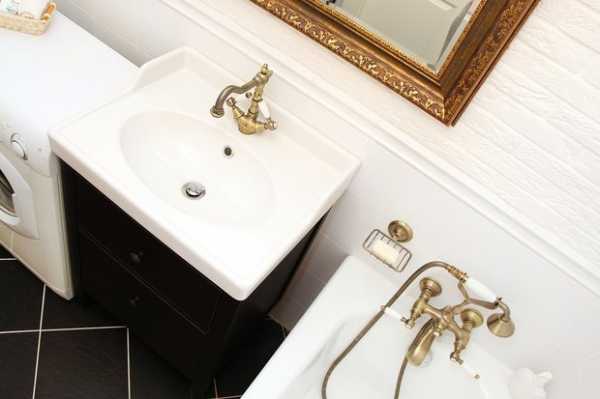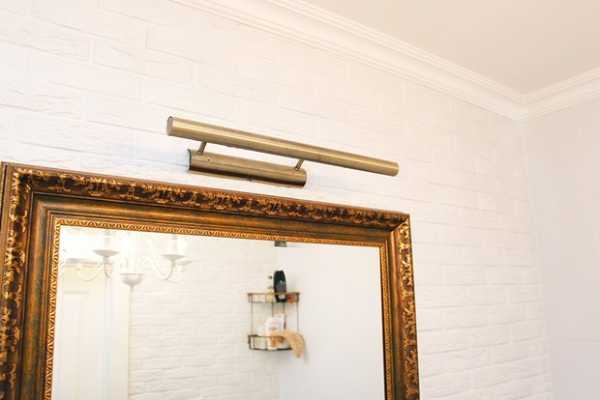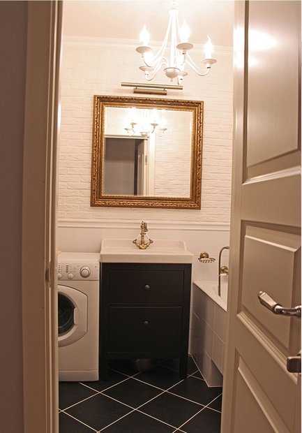 Так как ванная небольшая, цвет стен выбрали белый. От классики комнате «достался» потолочный плинтус, как в коридоре и спальне, и белая люстра с лампочками «свеча на ветру». От современности – текстура кирпича на стенах, как в гостиной. А изюминкой стало зеркало в багете с картинной подсветкой.