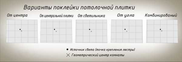 - От центра комнаты. Используется в случае, если в комнате нет люстры. Найти центральную точку можно проведя диагонали от противоположных углов. Точка их пересечения и есть место, где состыкуются первые 4 плиты.