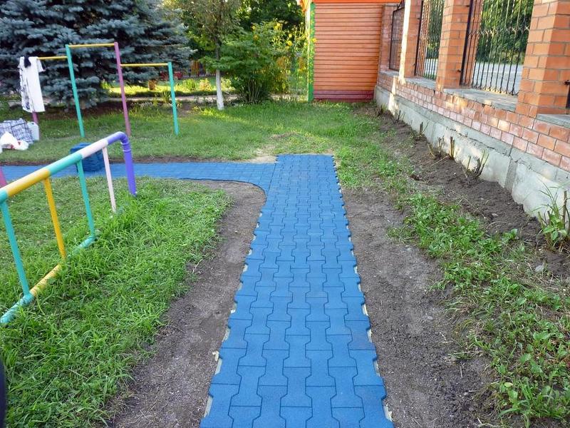 Резиновая плитка — это травмобезопасное покрытие, она поглощает силу удара при падении. Это является большим плюсом при использовании её в качестве покрытия детских и спортивных площадок на дачном участке.