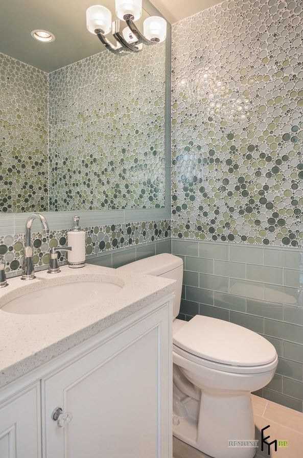 Еще одна акцентная стена из мозаики, но уже в более спокойном, хоть и разноцветном варианте. Мозаика очень выигрышно смотрится вместе с зеркальными поверхностями и глянцем однотонной плитки на соседней стене.