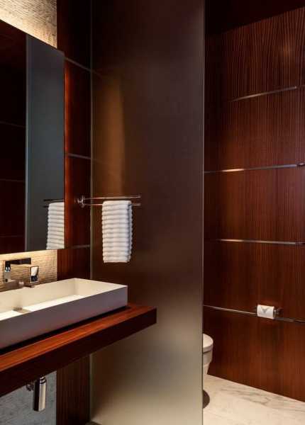 Тот редкий случай, когда дизайнер принимает решение использовать для облицовки пола деревянное покрытие, а плитку керамогранита пустить на облицовку одной из стен туалета. В результате получился строгий, не необычный дизайн утилитарного помещения.