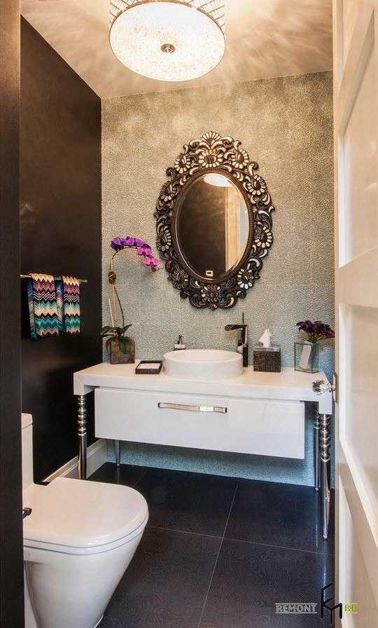 Освещение в небольшой по размеру туалетной комнате играет немаловажную роль. Свет не должен быть ярким, режущим глаза, напротив – предпочтительно мягкое, рассеянное освещение. Не желательно использовать громоздкий крупный светильник или массивную люстру. Гораздо интереснее и необычнее будут смотреться несколько небольших точечных светильников, расположенных в нескольких разных точках потолка или стен.