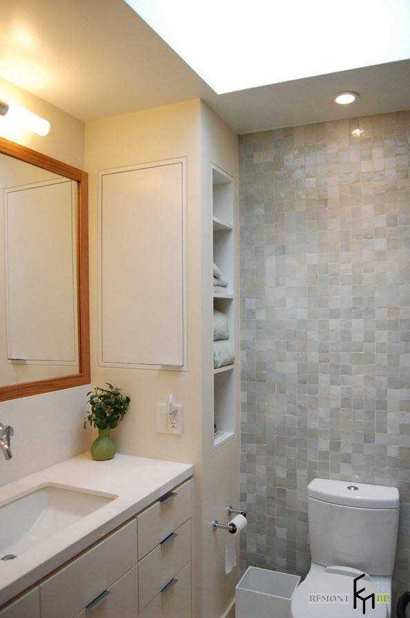- Рассмотреть возможность использования скрытой за отделкой мебели (шкафов или ниши). Значительно сэкономить пространство помогут также угловые полки, узкие шкафы, тумбы, совмещенные с раковиной. Там можно спрятать туалетную бумагу, освежители и другие принадлежности.
