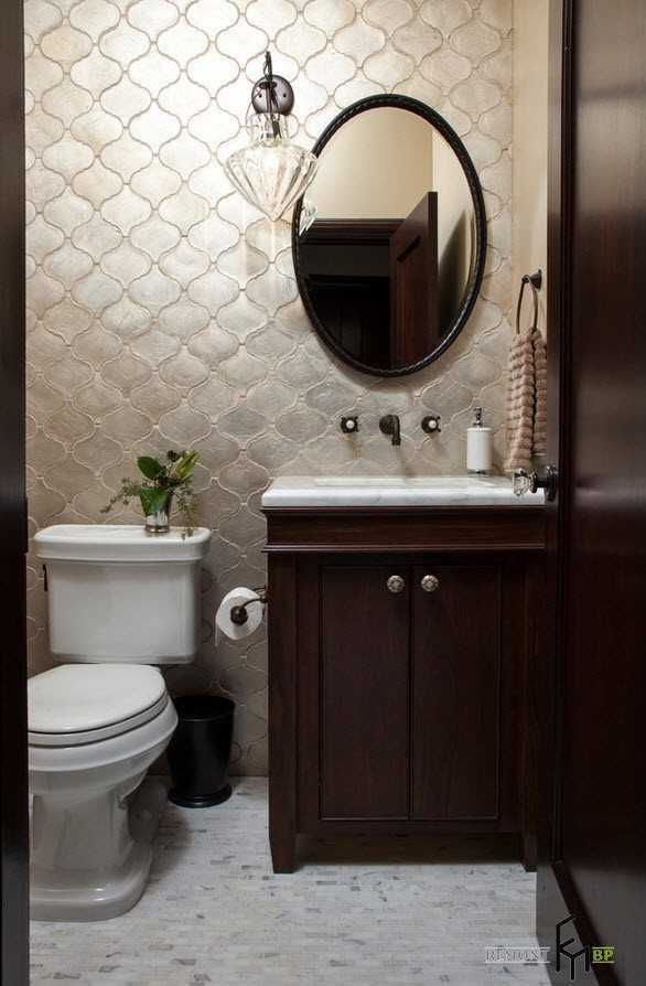 Оригинальная перламутровая плитка может стать украшением санузла в классическом стиле или стилистике барокко. Контрастное темное дерево меблировки и дверей только подчеркнули благородность цвета фактурной плитки.