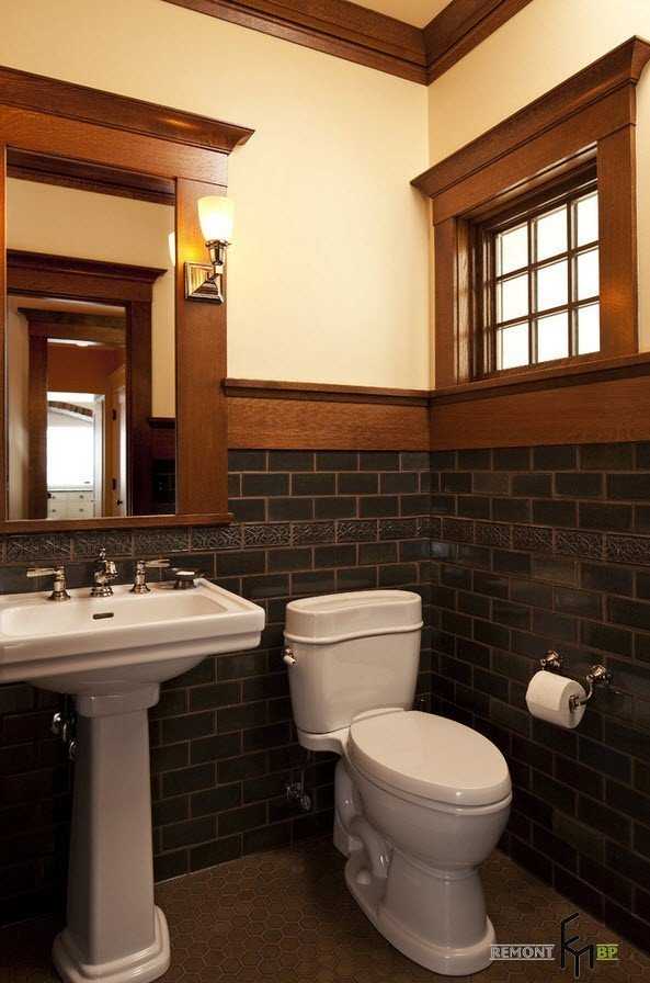 Темно-сера глянцевая плитка «метро» с коричневой затиркой в тон деревянным элементам – практичный и оригинальный вид отделки поверхностей туалета. На фоне темной плитки белоснежная сантехника выглядит еще более белоснежной.