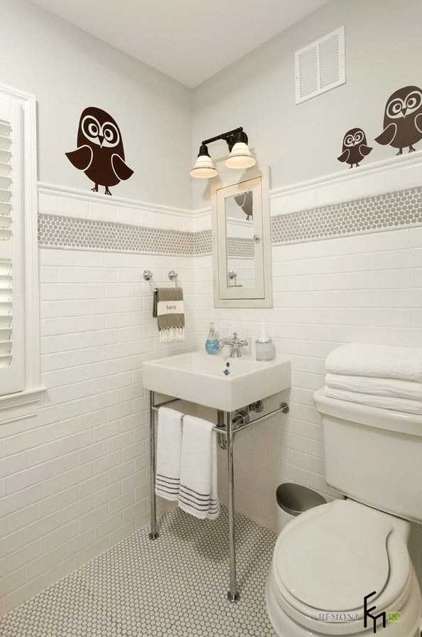 Не счесть количество дизайн-проектов утилитарных помещений, в которых принимала участие белоснежная плитка «метро» с аналогичной затиркой. Окантовка с помощью мозаичной плитки, использованной и для облицовки пола, и анималистические изображения разбавили светлую палитру санузла.